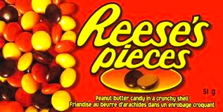 Reese’s Pieces are a peanut butter candy manufactured by The Hershey Company for the North American market; they are also available in Ireland and The United Kingdom. They are circular in shape and covered in candy shells that are colored yellow, orange, or brown. They can be purchased in plastic packets, cardboard boxes, or cup-shaped travel containers. The candy was introduced in 1978 and introduced to Canada in 1980. The relatively new product became very popular with the 1982 release of E.T. the Extra-Terrestrial, in which the candy is featured.