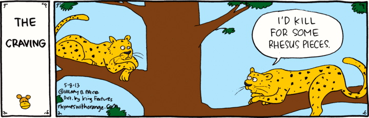 A rhesus/Reese’s pun that depends on your knowing about the candy called Reese’s Pieces. (And of course on your knowing about rhesus monkeys.)