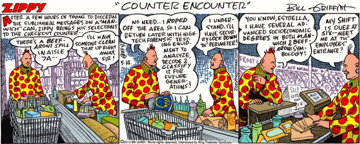 Zippy’s been reading the texts on food products, finding deep messages there.
