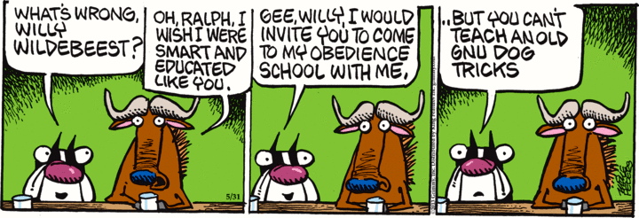 (A pun on gnu and new and a transposition of dog and new in You can’t teach an old dog new tricks — though a transposition of a N and an Adj is unlikely, though not unknown, in the world of inadvertent errors.)