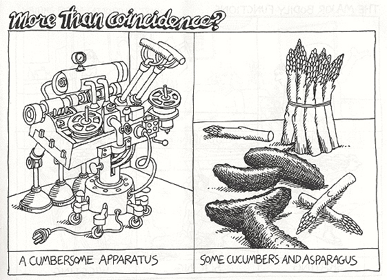 … The books that followed Cat consisted mostly of extremely bizarre cartoons that find their humor in their utter strangeness and unlikeliness. Many of these are cartoons that Kliban drew for Playboy. They often contained dysmorphic drawings of nude figures in extremely unlikely environments, as if to spoof Playboy’s own subject matter. Another frequent subject of satire were the type of wordless, step-by-step visual instruction manuals typically found with such things as office furniture. Kliban also had a recurring series of drawings called “Sheer Poetry,” in which the page would be split into six panels, containing images of objects whose names, when spoken in the order presented, would form a rhyming, nonsensical verse.