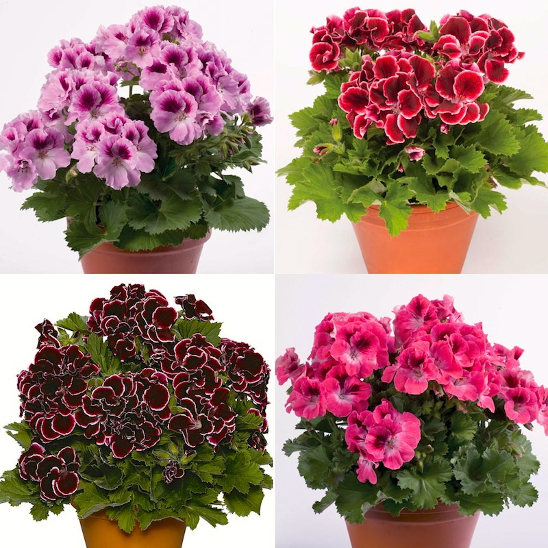 Three pelargonium photos: a single flower from a single-flowered rose pelargonium plant; a pot of fancy doubles; and four pots of fancy doubles in a different set of cultivars: