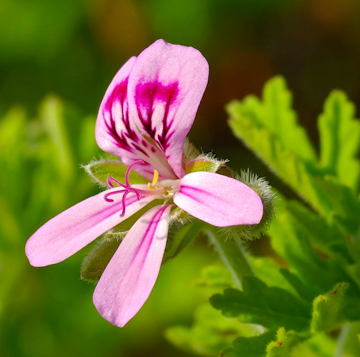 … Scented-leaf pelargoniums: Cultivars are derived from a great number of species, amongst others P. graveolens. [There are a great many of these, some of which I grow here in Palo Alto. Strictly speaking, pelargoniums in general have strongly scented leaves, but the standard ones smell “like geraniums” rather than like roses, cinnamon, apples, or whatever.]