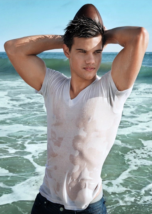 The third in the recent shirtless series — previously: Kellan Lutz here, Josh Duhamel here — brings us to Mr. Abs (Junior Division), Taylor Lautner, seen here in a characteristic pose: