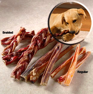 Animal consumption: Pizzles are almost exclusively used/produced today as chewing treats for dogs. They are a fibrous muscle, and are prepared by cleaning, stretching, twisting and then drying. Bully Sticks, as they are commonly called, can be smoked in a traditional smoker and can impart a smoked aroma if done with wood. They can also be sun dried or oven baked. The result is a very hard, 80–100 centimetres (30–40 in) long brown stick, which is then sawed into pieces appropriate for the size of the dog.