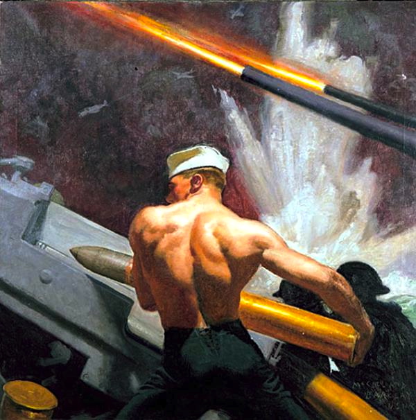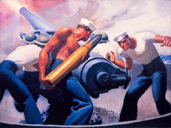 And then Gun Crew Loading a 5″ 38 Caliber Gun and 4″ 50 Caliber Mark XII Gun Crew in Action, Navy recruitment posters by McClelland Barclay: