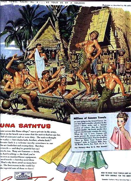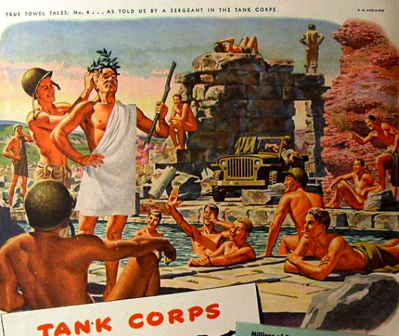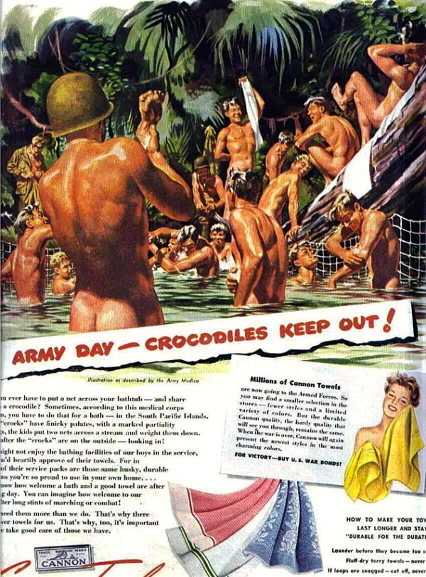 But the ads for towels were aimed at women back home presumably missing their menfolk and being relieved to know they were cavorting with other men rather than women.