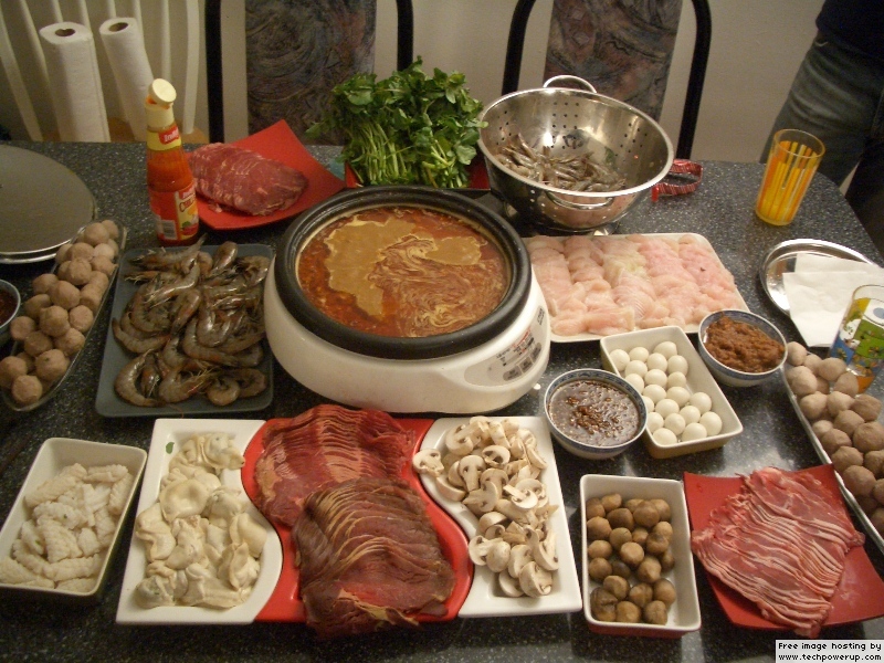 Hot pot …, less commonly Chinese fondue or steamboat, refers to several East Asian varieties of stew, consisting of a simmering metal pot of stock at the center of the dining table. While the hot pot is kept simmering, ingredients are placed into the pot and are cooked at the table. Typical hot pot dishes include thinly sliced meat, leaf vegetables, mushrooms, wontons, egg dumplings, and seafood. Vegetables, fish and meat should be fresh. The cooked food is usually eaten with a dipping sauce. In many areas, hot pot meals are often eaten in the winter. (Wikipedia link)