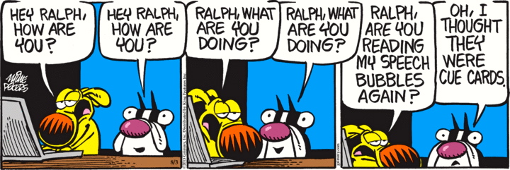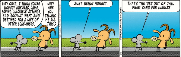 Three cartoons for today: a Pearls Before Swine on insults; a Mother Goose and Grimm meta-cartoon; and a One Big Happy on tongue twisters;