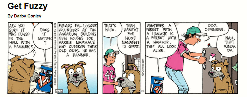 The strip’s humor comes from the conflict between Bucky’s and Satchel’s personalities, which are extreme stereotypes of cats and dogs. Sweet, trusting, naïve Satchel is routinely subjected to the exploitation of cruel, self-centered Bucky, who is always torturing the poor canine. Rob, the middleman, is often frazzled from dealing with them, or more specifically, from dealing with Bucky’s destructive nature and overall nastiness. The three characters live in an apartment on Boston’s Longwood Avenue. Get Fuzzy often eschews the traditional “setup-punchline” format of most funnies, instead building on absurd dialog between characters. (Wikipedia link)