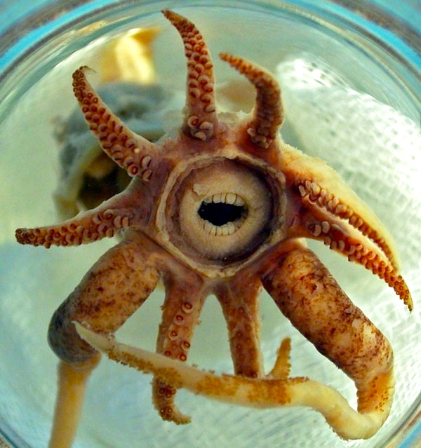 [Watt] In London [the mascot is] the proboscis monkey. In Edinburgh, the branch’s mascot is now the gob-faced squid… Its real name is Promachoteuthis sulcus. Until very recently it didn’t have a common name. We unofficially named it and it caught on. It looks like it has a human mouth in the middle of its body. It’s really creepy, freaky and a bit lopsided.