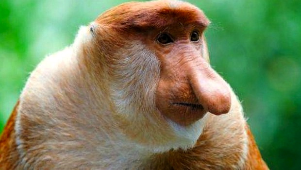 The proboscis monkey (Nasalis larvatus) or long-nosed monkey, known as the bekantan in Malay, is a reddish-brown arboreal Old World monkey that is endemic to the south-east Asian island of Borneo. (Wikipedia link)