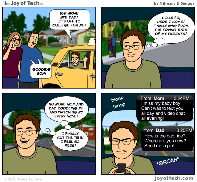 A Joy of Tech webcomic about a currently topical matter, going off to college: