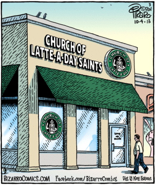 Plus a pun on the Church of Latter-Day Saints, that is, the Church of Jesus Christ of Latter-Day Saints, familiarly known as the Mormon Church.