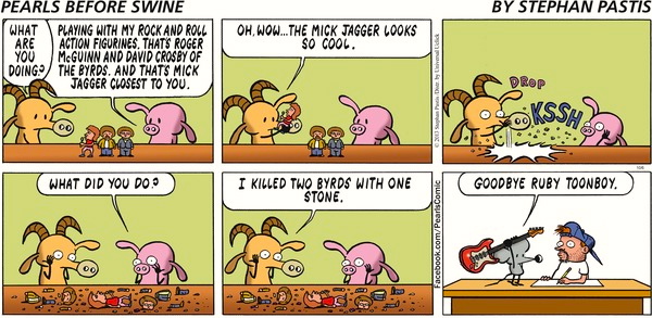 Stephan Pastis rolls with the pun (on the idiom/proverb to kill two birds with one stone), and Rat upbraids him (as usual). Rat also produces another pun, on “Goodbye, Ruby Tuesday”, by the Rolling Stones.