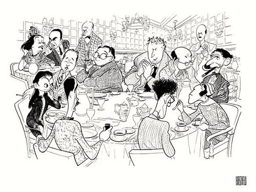(At the table, clockwise from left: Dorothy Parker, Robert Benchley, Alexander Woollcott, Heywood Broun, Marc Connelly, Franklin P. Adams, Edna Ferber, George S. Kaufman, Robert Sherwood. In back from left to right: Lynn Fontanne and Alfred Lunt, Vanity Fair editor Frank Crowninshield and Frank Case.)