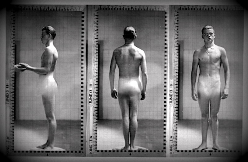 Sheldon’s book “Atlas of Men” is relatively available. It contains an enormous series of these photos categorized by a body type system that he claimed predicted psychology. Lots of images of attractive naked men, but the whiting out of the faces and genitals gives the whole thing a creepy serial killer vibe. All in all it’s a pretty fascinating book. Some more info: http://orgoneresearch.com/2009/11/11/the-atlas-of-men/