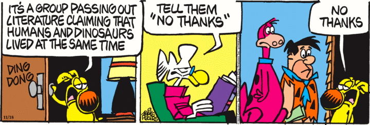 The conceit here is that the visitors at the door are indeed a dinosaur and a caveman — Dino and Fred Flintstone from the animated tv series The Flintstones.