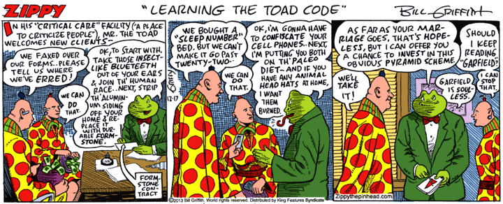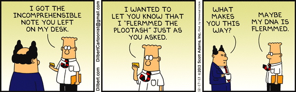 Three recent cartoons: a Dilbert, a Bizarro, and a Zippy.