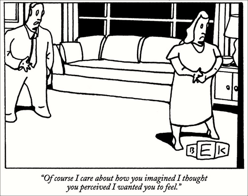 Bruce Eric Kaplan (born September 9, 1964), known as BEK, is an American cartoonist whose single-panel cartoons frequently appear in The New Yorker. His cartoons are known for their signature simplistic style and often dark humor. Kaplan is also a screenwriter and has worked on Seinfeld and on Six Feet Under. (Wikipedia link)