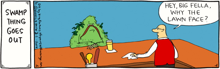(Discussed in my posting “Swamp Thing” of 3/1/14.) You can get the pun without the title, but you might well not recognize the drinker as the character Swamp Thing.