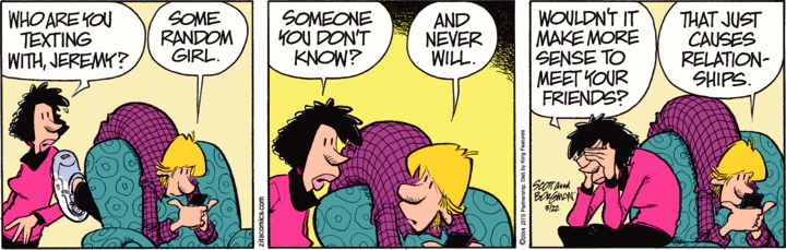 Jeremy in Zits defends texting as a way to communicate without risking a relationship: