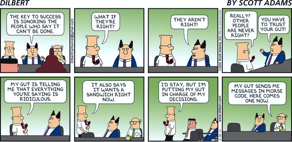 Dilbert: taking literally the idiom my gut tells me … , as if the gut can speak.