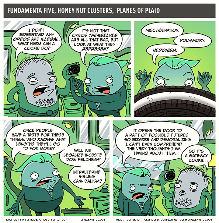 And the Multiverse, ostensibly about Oreos, meanwhile introducing amazing phrases like dog felching and intrauterine sibling cannibalism: