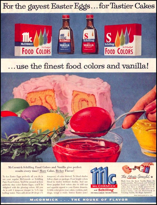 To dye Easter Eggs perfectly all you do is use your regular McCormick or Schilling Pure Food Colors. You’ll be amazed at how perfectly they color Easter Eggs: you’l be delighted with the glowing colors. All you do is add 1 teaspoon vinegar to 1/2 – 3/4 cup boiling water. Then add about 20 drops (1/8 teaspoon) of color desired. To blend shades follow chart on package. Four bright colors blend to twelve different shades. And use these popular food colors also to add eye and appetite appeal to your Easter desserts. A little color gives your cakes, cookies, puddings, icings a really festive Easter note!