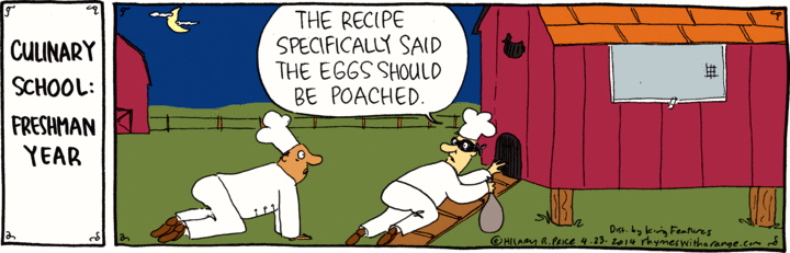 On #2: a pun on two senses of poach, roughly ‘cook an egg (in a specific way)’ and ‘hunt or catch illegally’. According to NOAD2, the etymology of the first is straightforward (ultimately from Old French pochier, earlier ‘enclose in a bag’, from poche ‘bag, pocket’). The second is more complex. NOAD2 has early 16th century ‘push roughly together’ (this could use more thought about the semantics), apparently related to poke (though it suggests that OFr pocher might have contributed to this sense as well as the first).