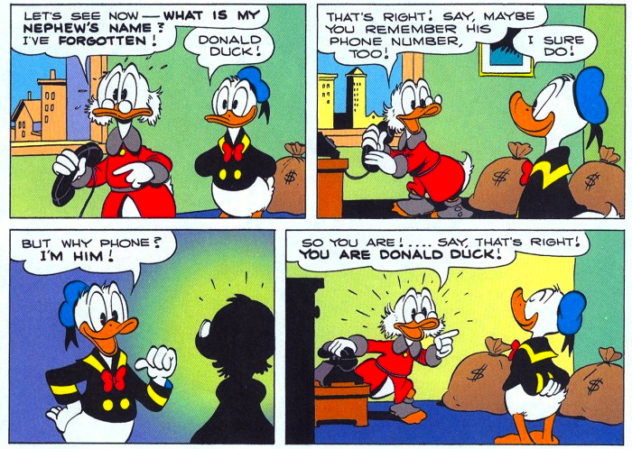 The stories are also very cinematic. They have a clear beginning, middle, and end, and operate in scenes, unlike many comic strips and books. Barks’s stories just move from panel to panel, but flow in sequences – sometimes several pages long – that lead to new sequences.