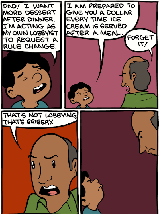 Lobbying is legal, bribery not, but in the U.S. the laws governing lobbying are complex enough that it’s not always clear when lobbying activities cross the line. The scheme in the cartoon is a transparent and cynical attempt to blur the line.