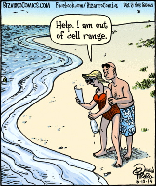Here, a classic gag-cartoon trope, the message in the bottle, is updated to embrace the age of cellphones.