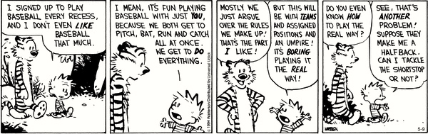 The inventions require kids — usually just in pairs — who are psychologically very close; twins are particularly inclined to engage in such innovations, both in games and language. Calvin and Hobbes are a special case here, since Hobbes is in a sense Calvin’s twin — a projection of part of Calvin’s personality. No surprise, then, that Calvin finds it especially satisfying to play just with Hobbes!