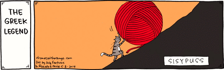 Appreciating the pun in the strip requires that you know about the myth of Sisyphus, including the task assigned to Sisyphus. In the strip, of course, it’s not a giant boulder that Sisyphus pushes up the mountain again and again, but a giant ball of yarn that a cat has to deal with.