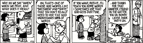 3. One Big Happy: Ruthie and her brother Joe on God talk. Language in religious contexts is surrounded by any number of conventions, serving different functions (including using archaic language to show respect for God, as in the first two panels here):