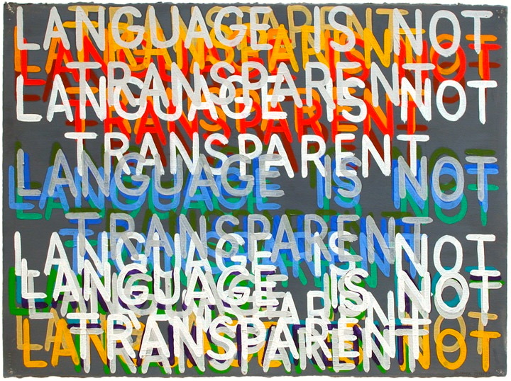 A Bochner theme from then and now: Language Is Not Transparent, in several versions in different media (rubber stamps, chalk on a wall) from 1969-70 and then in 1999, in oil on paper:
