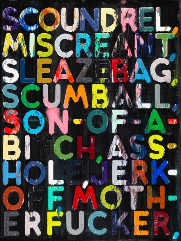 They feature lists of synonyms, many gleaned from Roget’s Thesaurus, and often colloquial and vulgar ones. While some are made with a brushy touch, others are neatly lettered in juicy colors and in horizontal rows on flat, colored backgrounds, like Modernist stripe paintings.