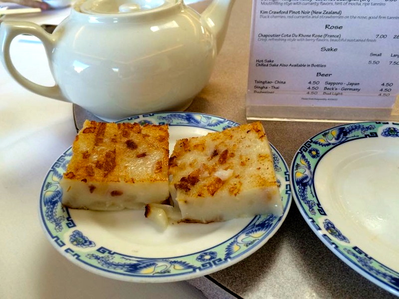 Turnip cake … is a Chinese dim sum dish made of shredded radish (typically Chinese radish or daikon) and plain rice flour. The less commonly used daikon cake is a more accurate name, in that Western-style turnips are not used in the dish; it is sometimes also referred to as radish cake, and is traditionally called carrot cake in Singapore. It is commonly served in Cantonese yum cha and is usually cut into square-shaped slices and sometimes pan-fried before serving. Each pan-fried cake has a thin crunchy layer on the outside from frying, and [is] soft on the inside. The non-fried version is soft overall. It is one of the standard dishes found in the dim sum cuisine of Hong Kong, China, and overseas Chinatown restaurants. It is also commonly eaten during Chinese New Year, since radish (菜頭, chhài-thâu) is a homophone for “good fortune” (好彩頭, hó-chhái-thâu) in Hokkien. In Taiwan, turnip cake is also commonly eaten as part of a breakfast.