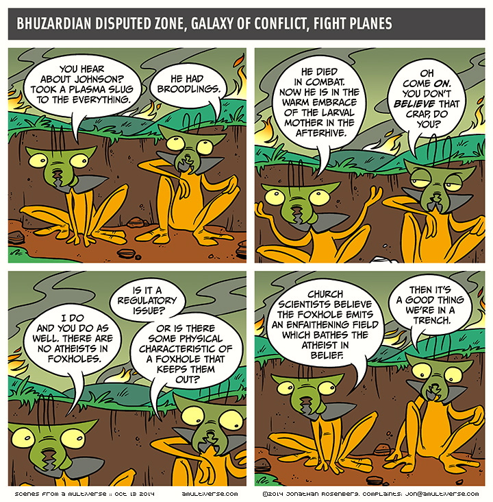 Here, the presumed lack of atheists follows from the nature of warfare and of human belief. In the Multiverse version, foxholes themselves are causative agents, via an atheism-suppressing force field. Different sources, same consequence.