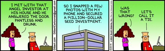 Dilbert. In #1 Alice tells Dilbert that she’s been approached by an investor interested in her startup idea. Dilbert is suitably wary, but Alice’s account gets more and more suspicious: drinks at his house on Saturday night, and then his persistent texting to say that he can’t wait to fund her. Yeah, fund.