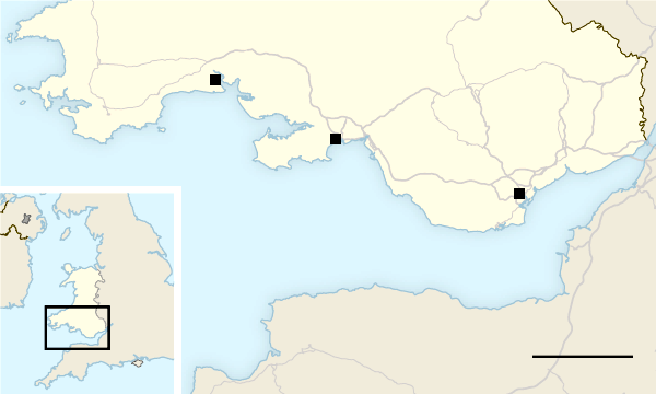 A map of south Wales, showing three locations — from west to east, Laugharne, Swansea (where Thomas was born and where he wrote much of his early poetry), and the Welsh capital, Cardiff: