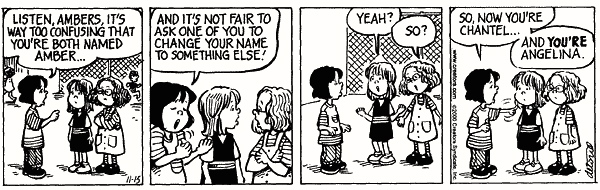 In #1, Ruthie resolves the problem of having two friends named Amber (which won’t do, because personal names are unique identifiers in her world) by even-handedly assigning them both new names.