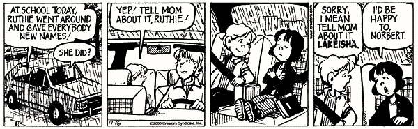 One Big Happy has another episode today on Ruthie and names. In the last instalment, she solved the problem of having two friends with the same personal name, Amber, by giving each of them a new name — Chantel and Angelina, though it’s far from clear that they’re comfortable with her choices. Now Ruthie has taken upon herself the (divine) power of the Giver of Names: