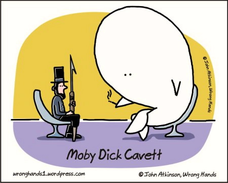 Many of his cartoons are language based. Here’s a more recent one, from 9/19/14, with a POP (phrasal overlap portmanteau): Moby Dick + Dick Cavett: