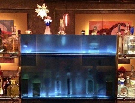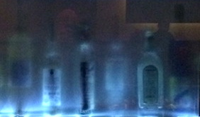 Reminiscent of the paintings and water-colors of J.M.W. Turner. In fact, this is a photo (from the back, through blue glass) of bottles on the shelves at the restaurant Reposado in Palo Alto.