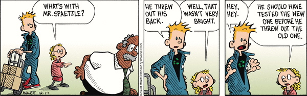 The strip turns on an ambiguity of the (separable) V + Prt combination throw out: the high-frequency sense ‘discard’ and the very specialized sense in throw out one’s back ‘experience sudden acute back pain’. Naturally, kids go for the ‘discard’ sense.
