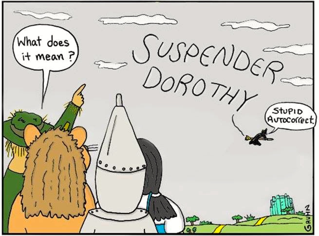 A Mike Gruhn WebDonuts cartoon, with autocorrect in skywriting: