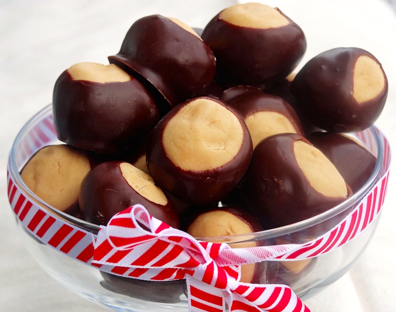 … Buckeye candy, made to resemble the tree’s nut, is made by dipping a ball of peanut butter fudge in milk chocolate, leaving a circle of the peanut butter exposed. These are a popular treat in Ohio, especially during the Christmas and college football seasons.