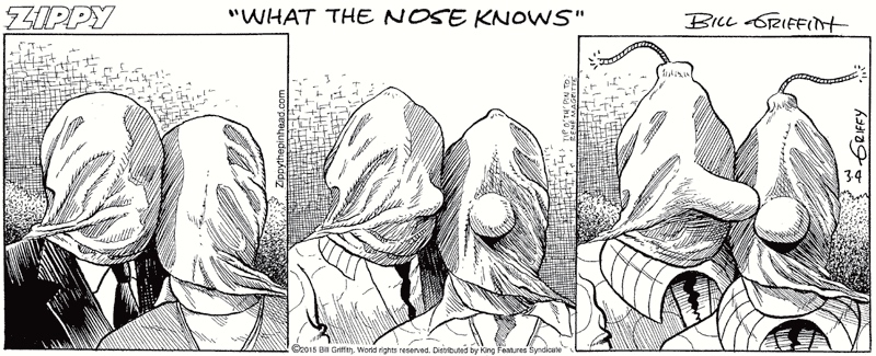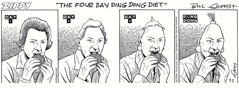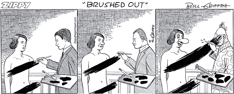 Today’s Zippy, another exercise in cartoonization, a transformation of an image (in this case, Magritte’s Le therapeute) by stages into a Zippy scene: